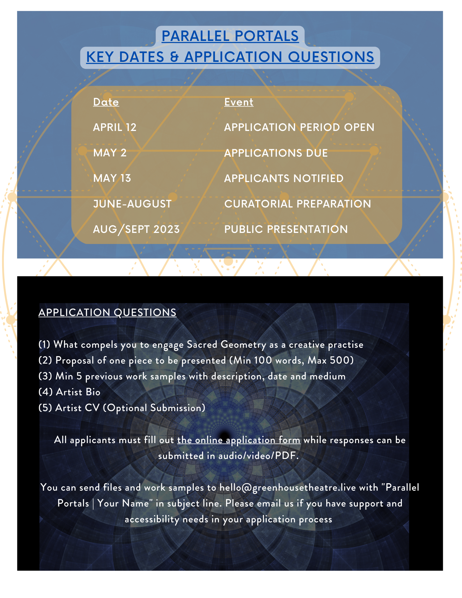 to present 2-4 pieces of work in any discpline at the Fall 2023 presentation of Parallel Portals. The work will explore the questions above through an expression of Sacred Geometry